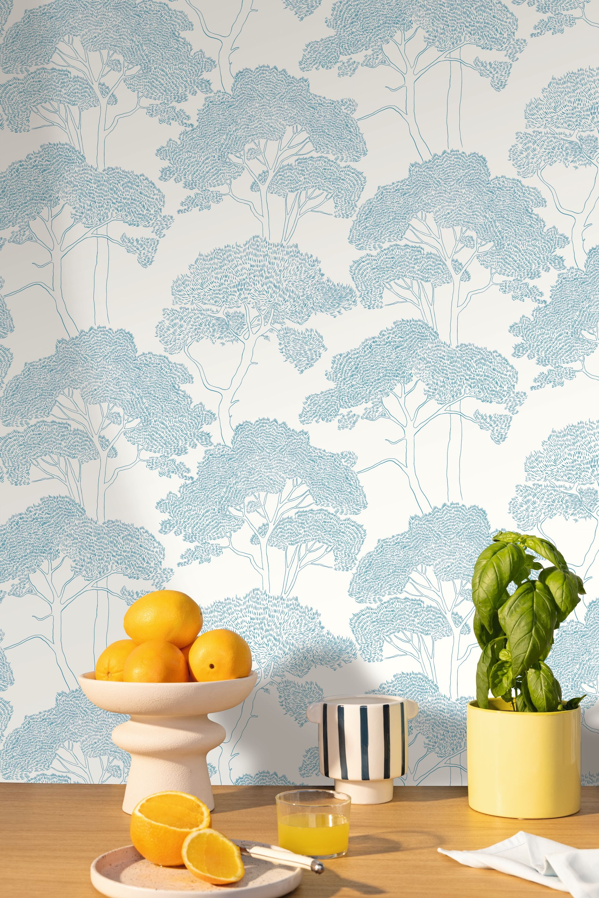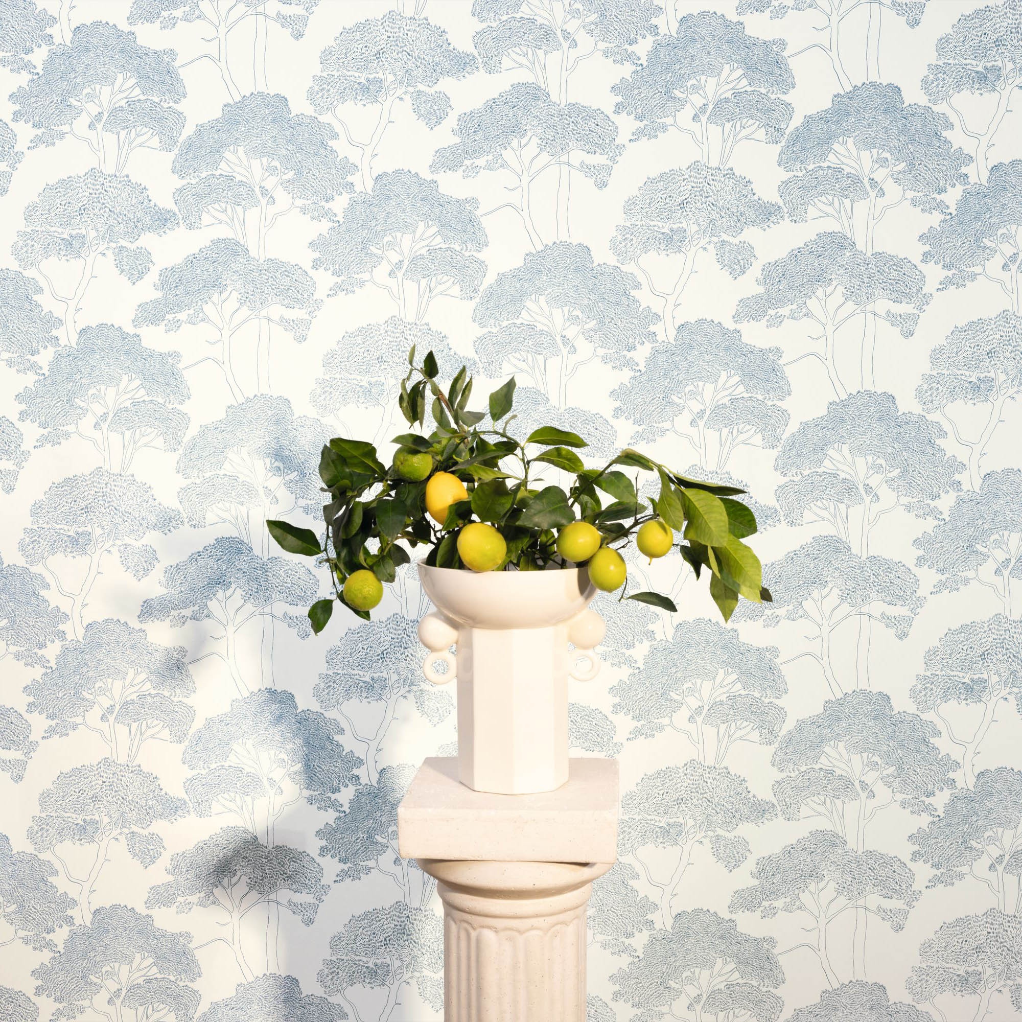 Este diseño de papel pintado está inspirado en los pintorescos paisajes de La Ciotat. Los delicados trazos azul celeste del follaje y los troncos aportan un toque elegante y sutil a la decoración.