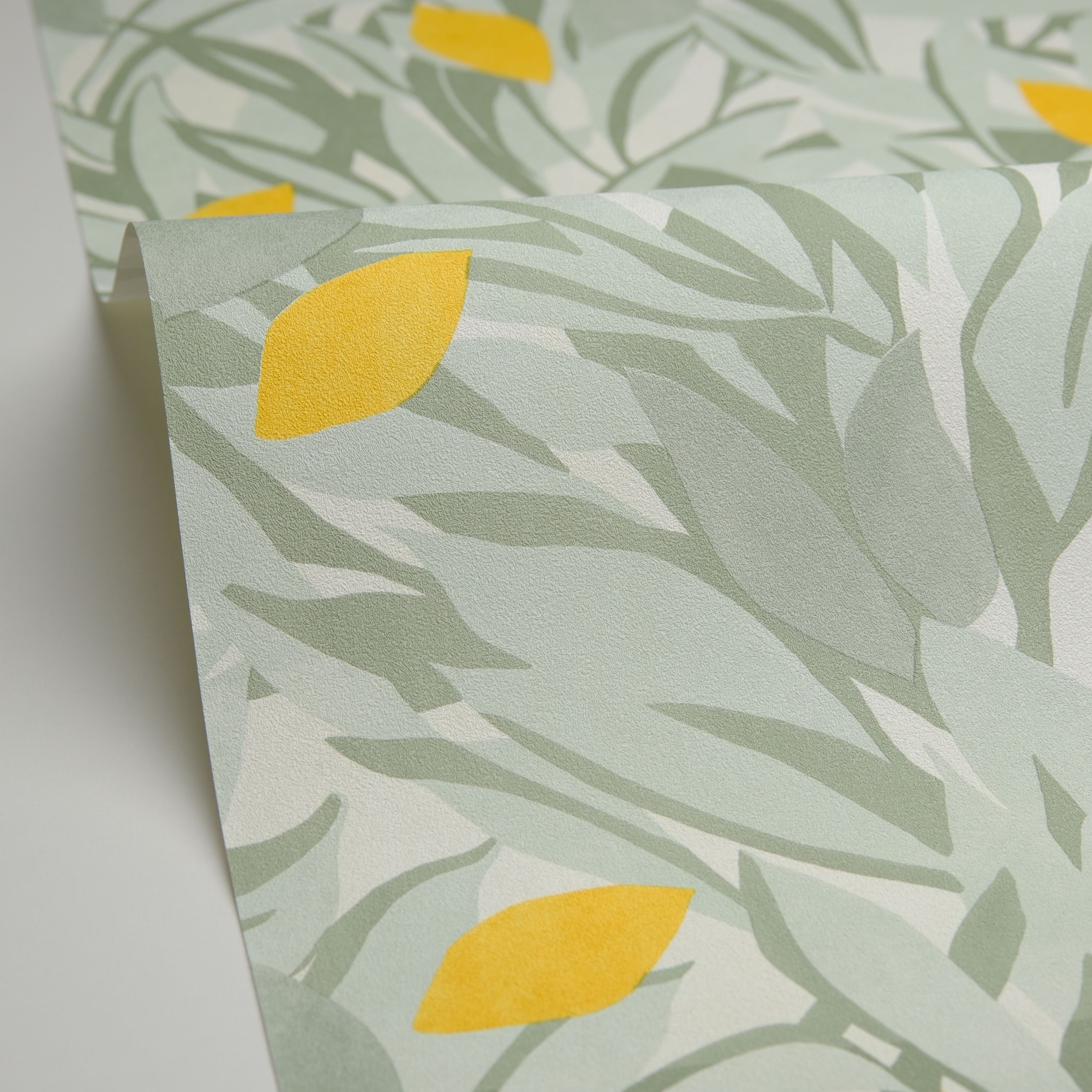 Este diseño de papel pintado es una reproducción de limoneros en tonos verde arcilla y verde opalino sobre fondo blanco. Las formas de color amarillo representan los limones. Este motivo vegetal vitamínico es ideal para crear un ambiente soleado que recuerda a los paisajes de Cassis.