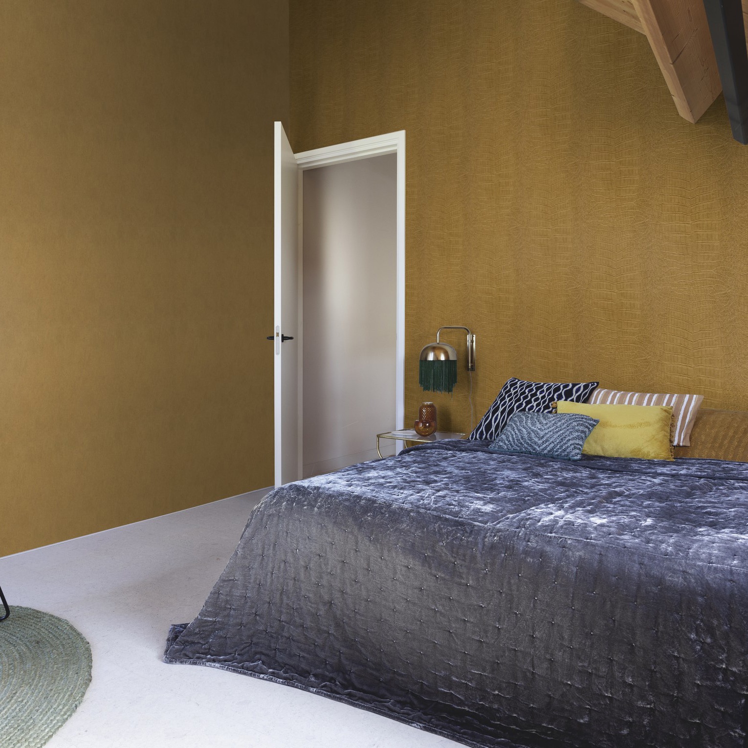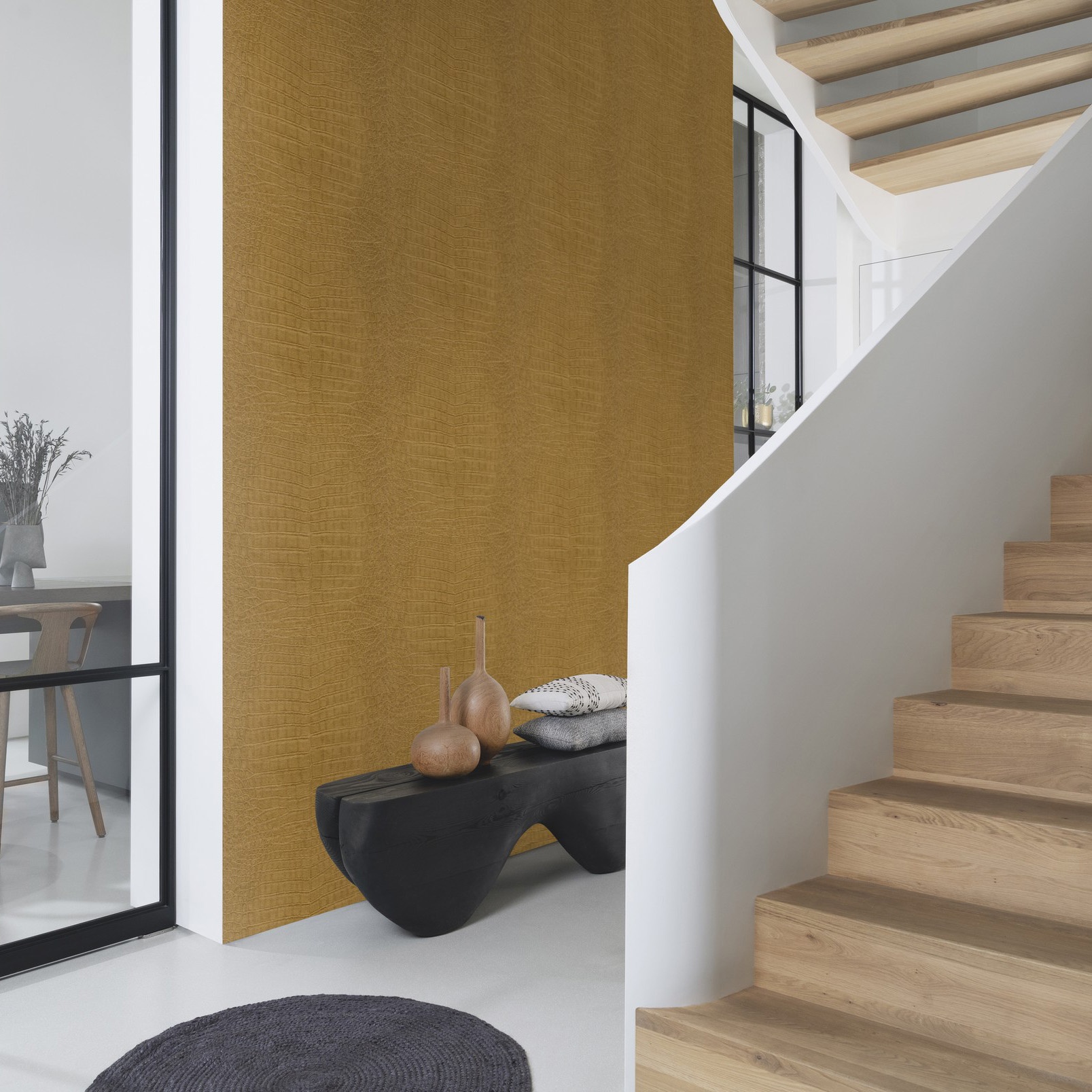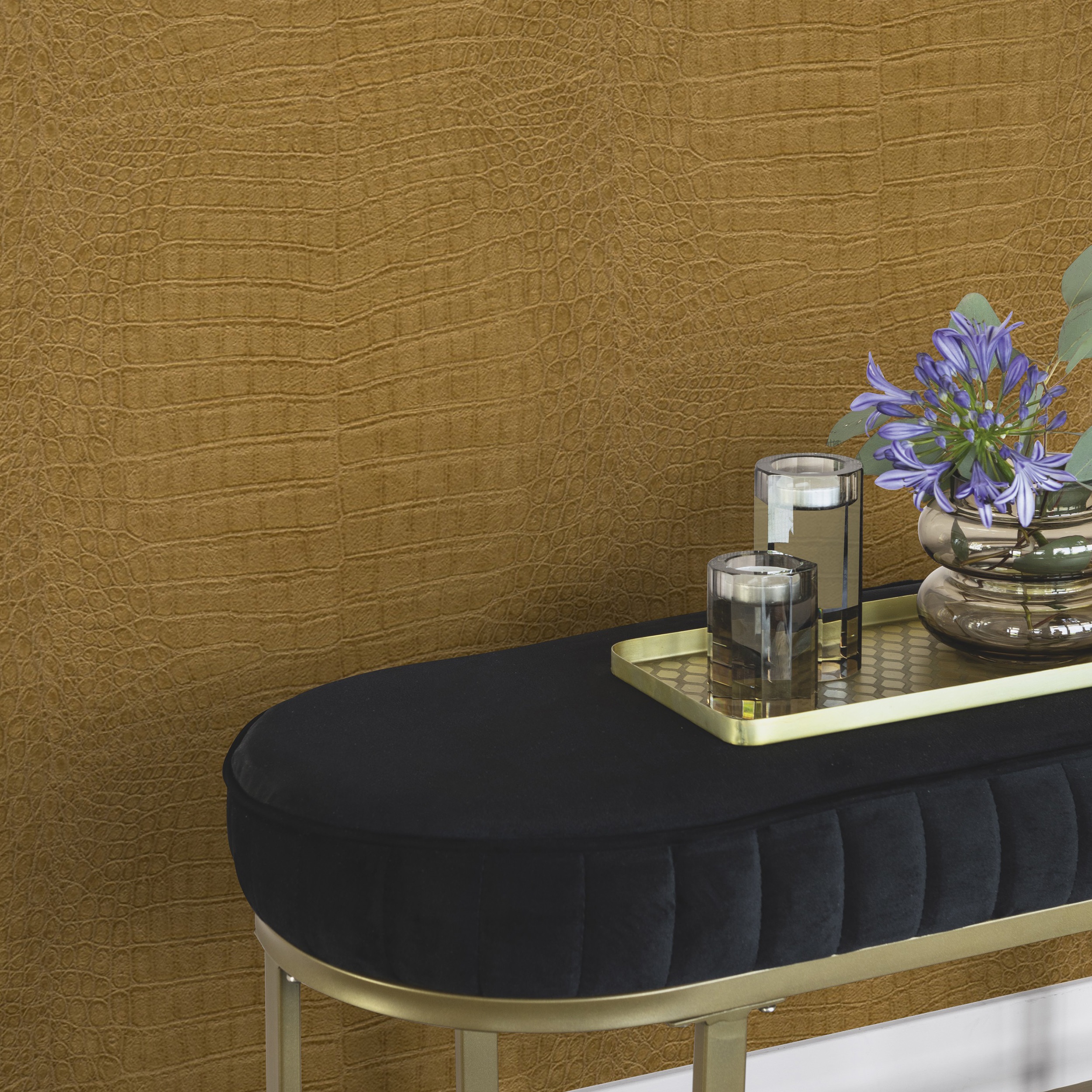 Diseño inspirado en la riqueza cultural y natural de África. Su elegante acabado imita la piel de cocodrilo en tono dorado, con efecto metálico y textura con un ligero relieve. Aporta un toque exótico, sofisticado y artesanal a cualquier espacio.