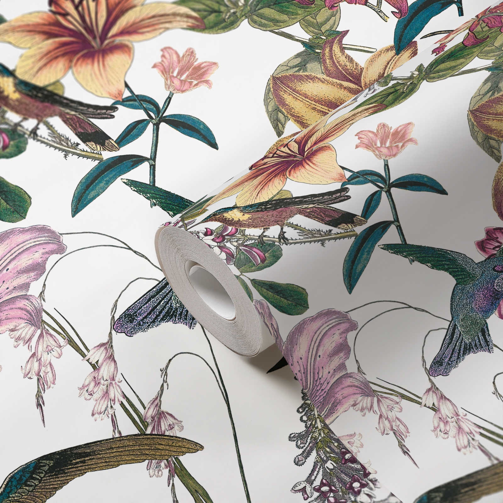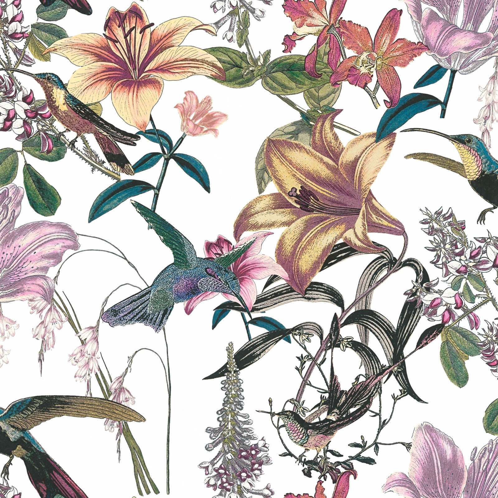 Papel Pintado con estampado Aves entre flores de hibisco en color principal multicolor