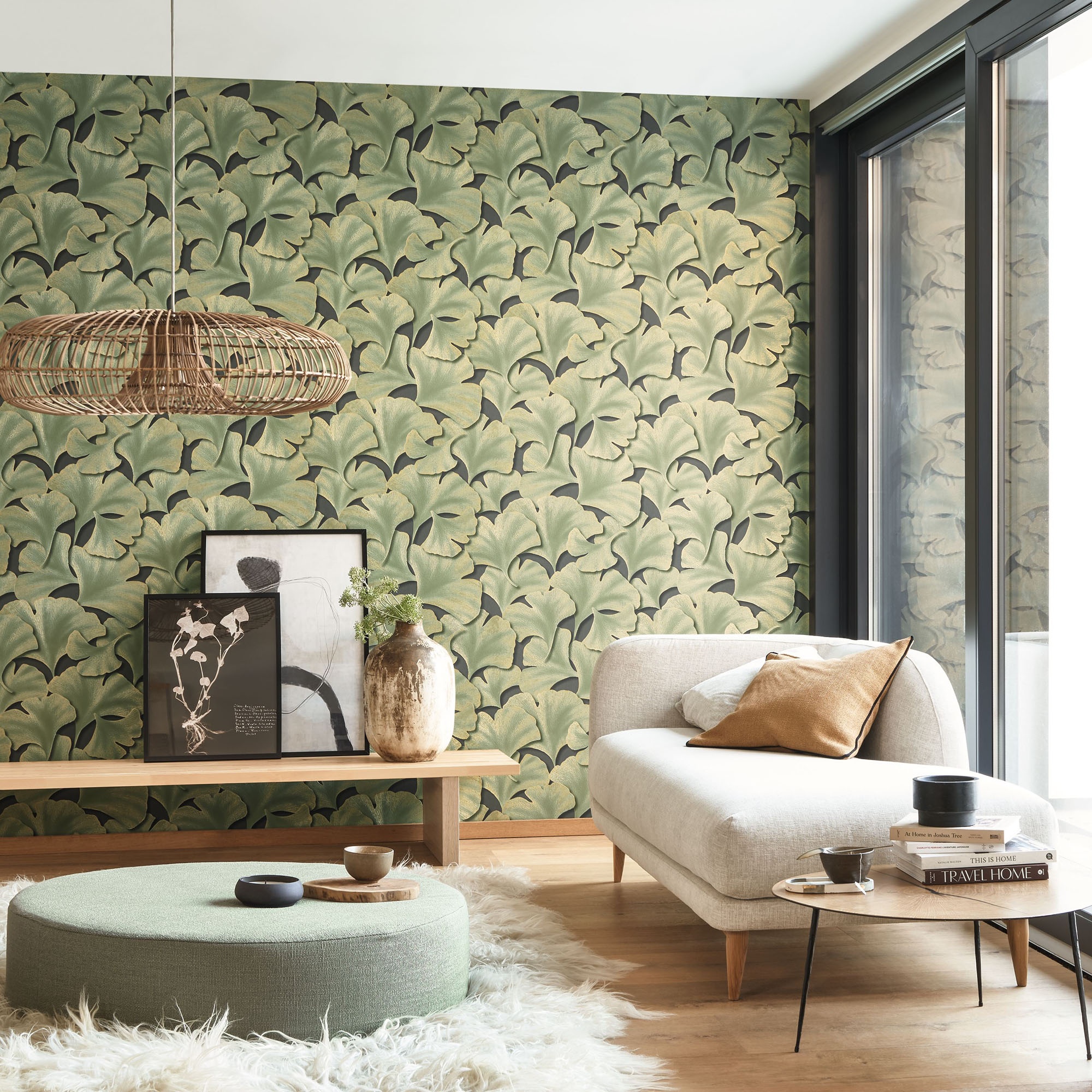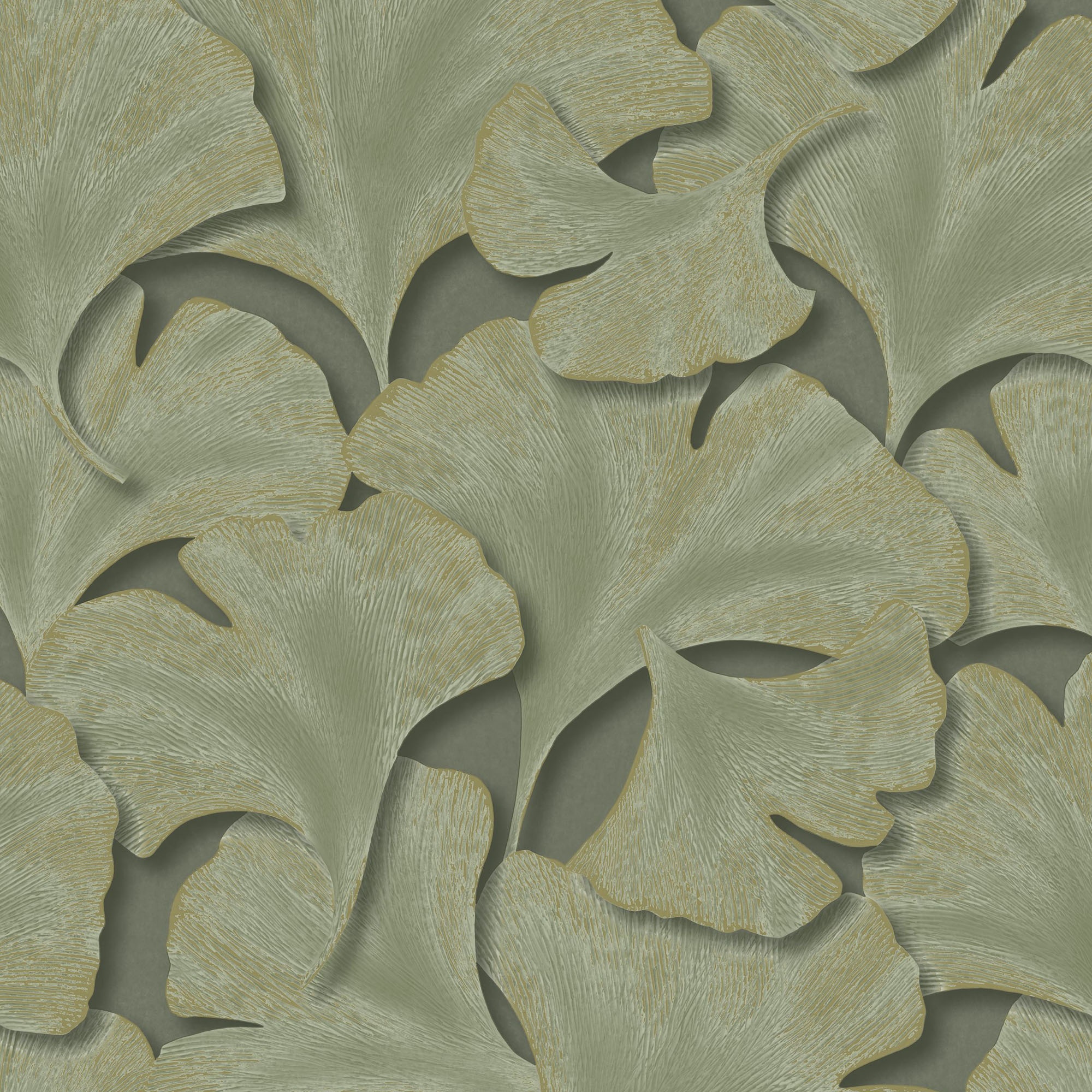 - Papel Pintado con estampado de Hojas de Gingko texturizadas en color principal Verde kaki