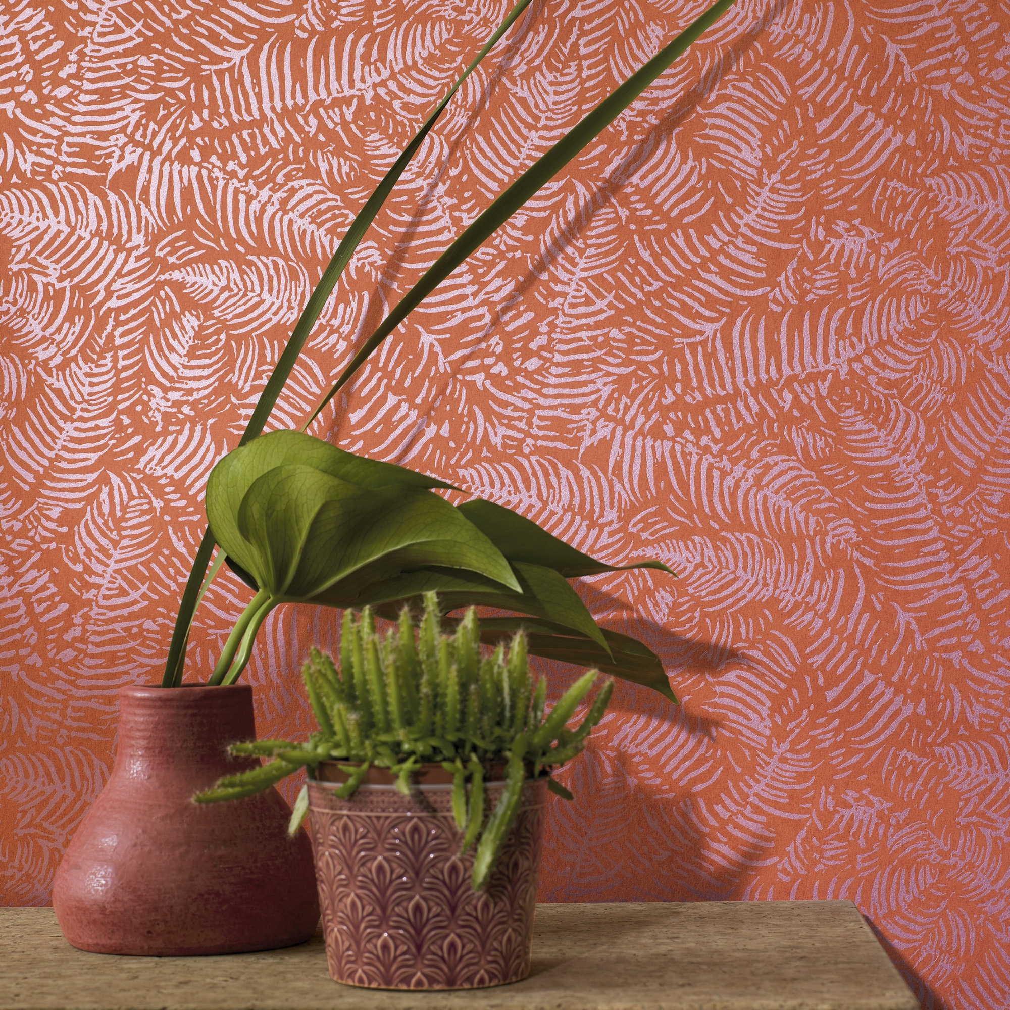 Las pequeñas hojas de helecho se dibujan en este papel pintado en todas direcciones, en tono coral con un increíble resplandor iridiscente. El fono coral mate dinamizará la estancia ofreciendo una suavidad salvaje.